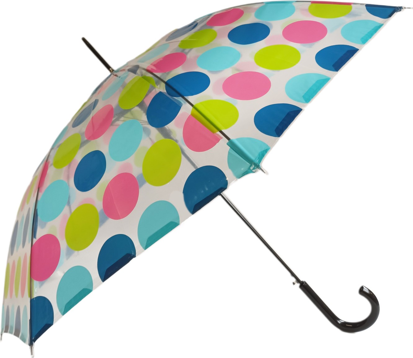 Lange S. Oliver transparante paraplu met kleurrijk stippenpatroon en rieten handvat